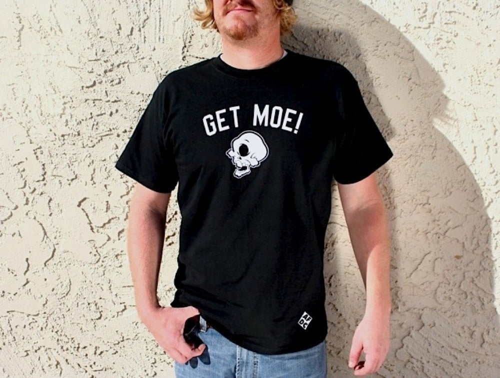 Get Moe in front and BADMOEFOE.com on back in white.